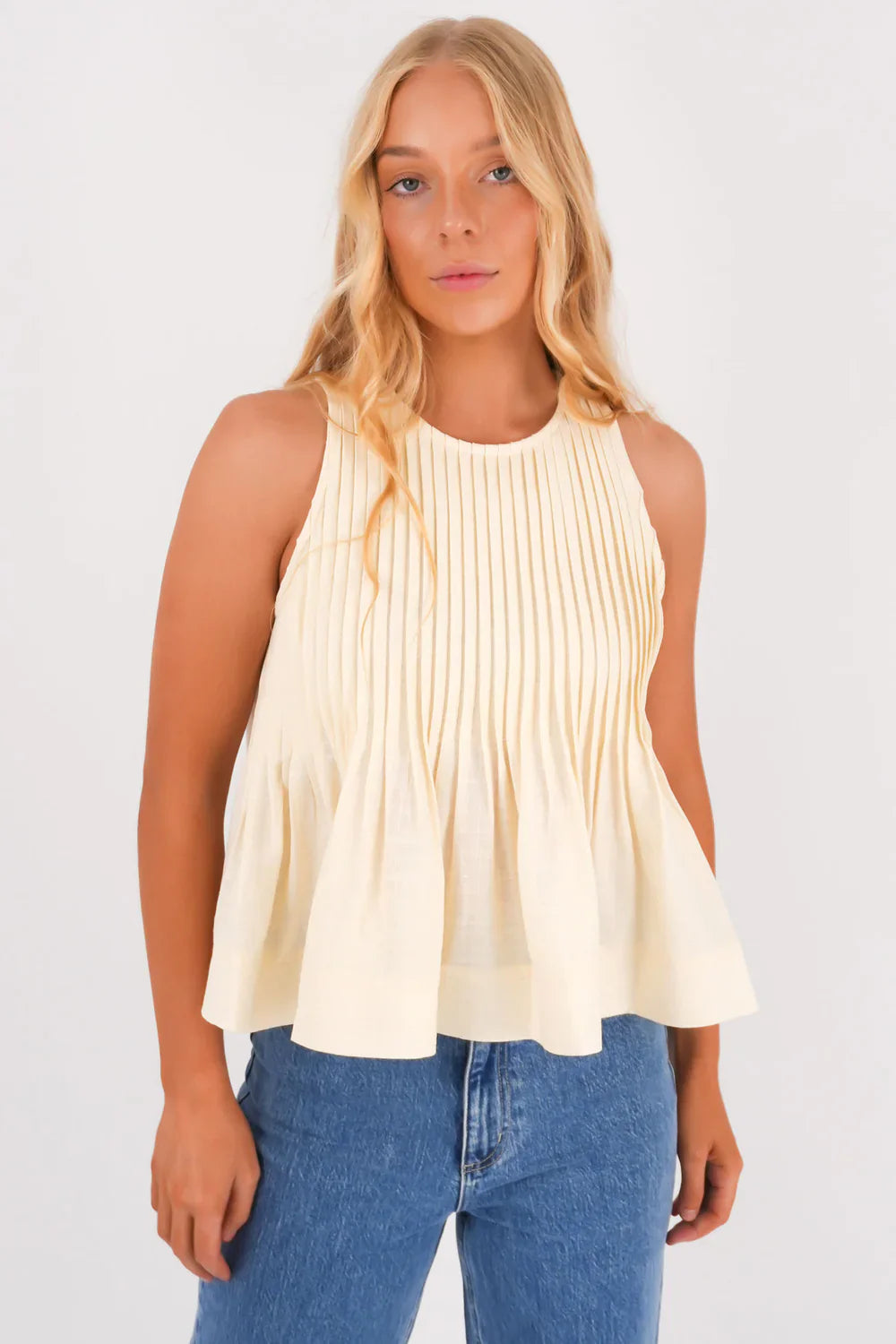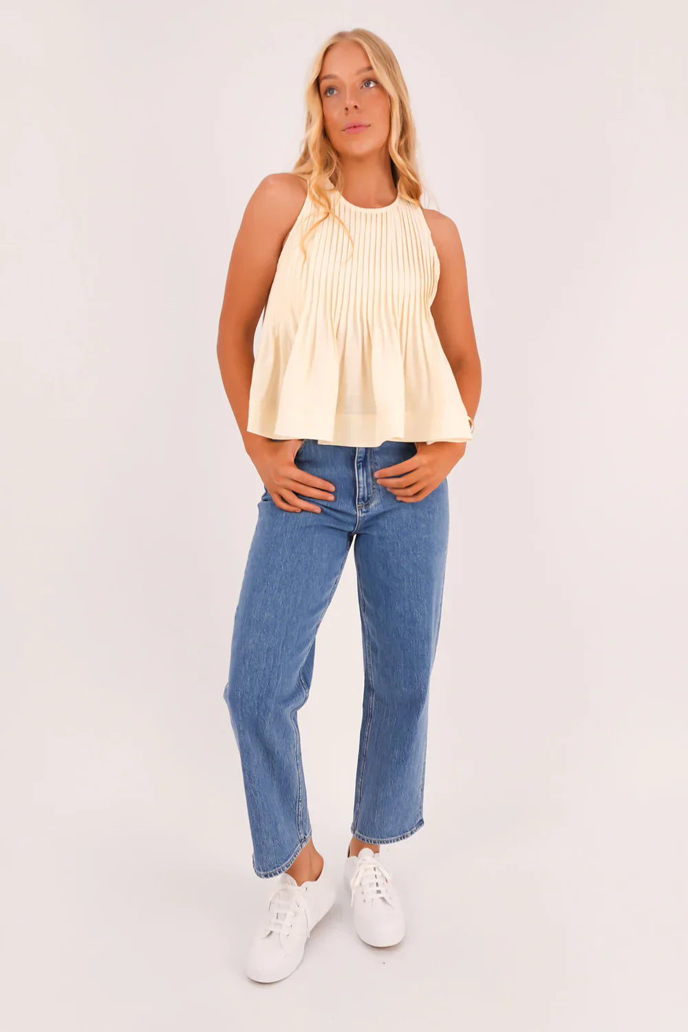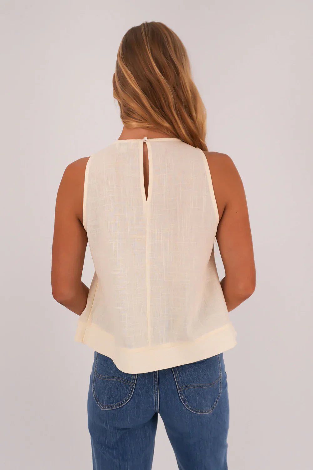 A soft woven fabric drapes into a swingy shape, finished with crisp pintucks through the front and a neat keyhole at the back neck. Easy to throw on with denim or tailored pants.